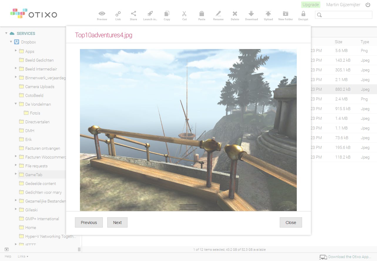We kunnen ons voorstellen dat je niet altijd precies weet wat een bepaald bestand precies inhoudt, zeker wanneer je veel verschillende bestanden hebt op veel verschillende diensten. Dan kun je dat bestand downloaden om te bekijken wat het is, maar dat kost je via Otixo dataverkeer en is bovendien niet handig. De makers hebben hiervoor een voorbeeldweergave ingebouwd. Wanneer je dubbelklikt op een foto, een video of een muziekbestand, dan krijg je een voorbeeldweergave te zien. En hoewel dat natuurlijk ook dataverkeer kost, gaat dat niet van je limiet af. Zo kun je dus mooi even spieken.