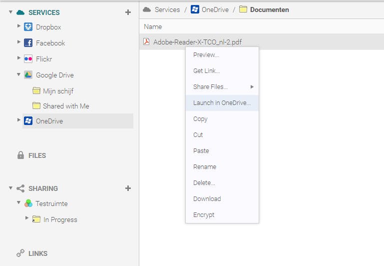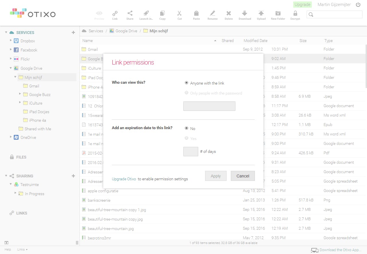 Een van de voordelen van de meeste clouddiensten is uiteraard dat je heel eenvoudig naar bestanden kunt linken om ze met anderen te delen. Ook daar hebben ze bij Otixo aan gedacht. Ongeacht in welke dienst je de bestanden hebt staan, kun je er vanuit de webinterface of app naar linken. Navigeer hiervoor naar de map of het bestand waarnaar je wilt linken en rechtsklik op het betreffende bestand of de map. In het menu dat verschijnt klik je op Get link. Er wordt nu een link voor je aangemaakt (naar Otixo, niet naar de clouddienst zelf) waarbij je zelf kunt aangeven welke permissies de gebruikers hebben. Voor dat laatste heb je wel een betaald account nodig.
