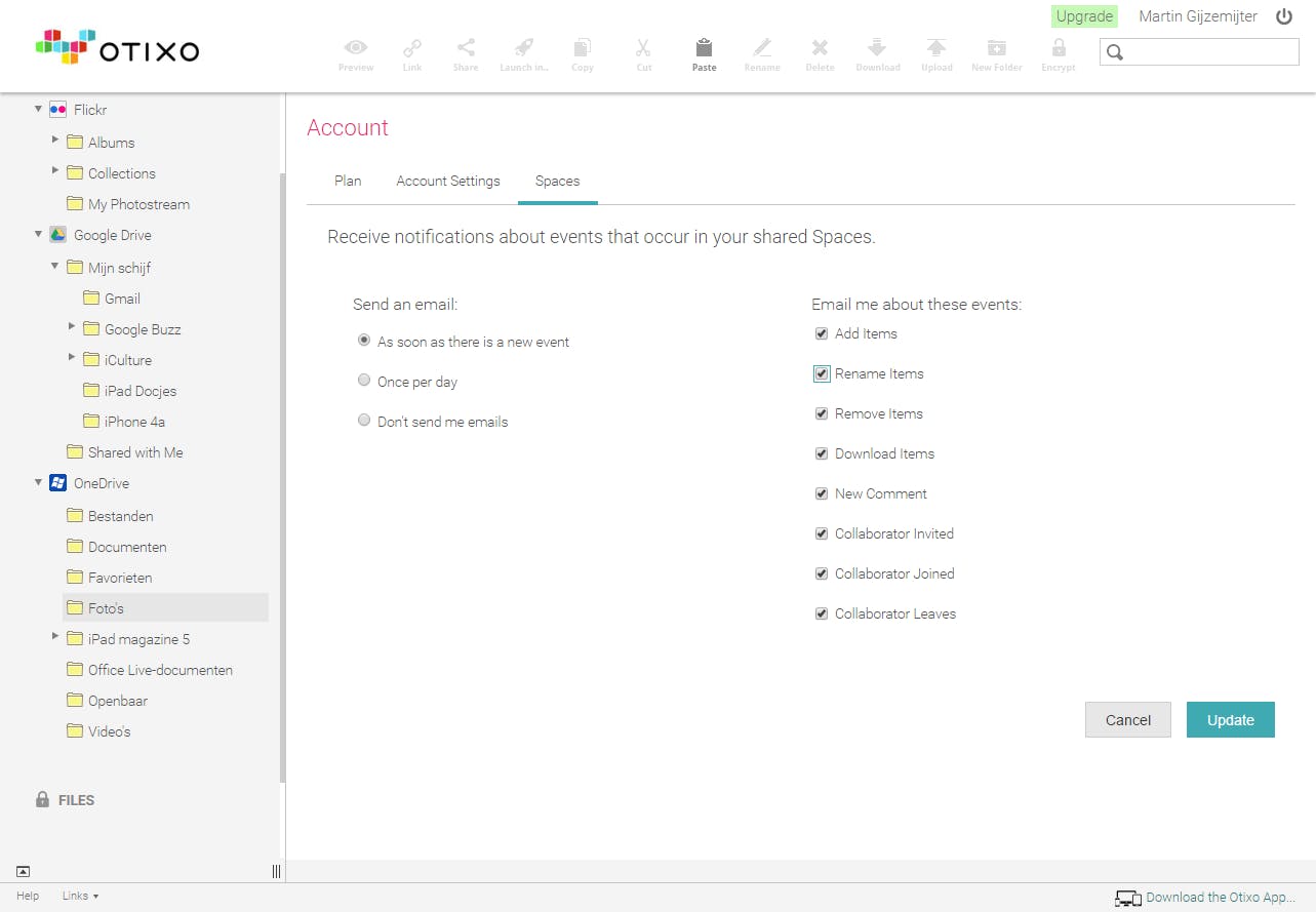 Hoe weet je nu wat er allemaal in je Space gebeurt, en dat je diensten niet een groter zooitje worden in plaats van een kleiner zooitje?. Klik hiervoor op je accountnaam rechtsboven en vervolgens op Spaces. Je kunt dan aangeven dat je een e-mail wilt ontvangen zodra er iets in je Space gebeurt. Zou houd je prima overzicht.