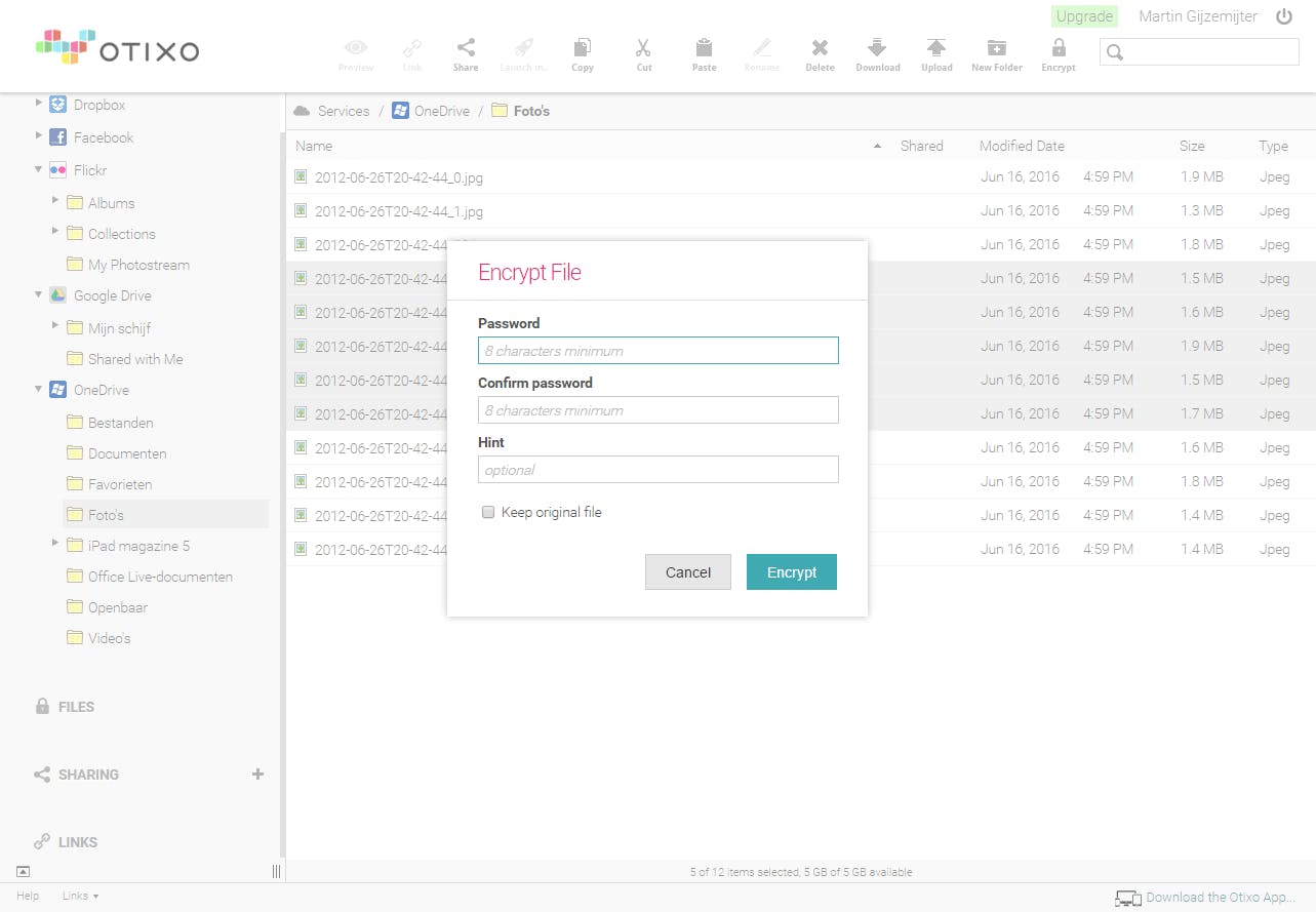 Staan er privacygevoelige bestanden op je clouddiensten? Dan is het goed om te weten dat je je bestanden kunt versleutelen. Selecteer de bestanden die je wilt versleutelen, rechtsklik en kies voor Encrypt. Voer een wachtwoord in (tweemaal) en klik op Encrypt. De bestanden zijn nu niet meer te bekijken zonder Otixo, dus zorg ervoor dat je dat wachtwoord nooit vergeet. De versleutelde bestanden worden verzameld onder het kopje Files in het linkerdeelvenster en je ontsleutelt ze door erop te klikken met de rechtermuisknop en te kiezen voor Decrypt.