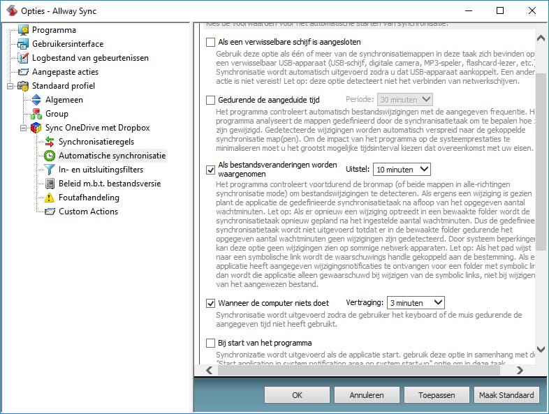 Klik nu op Taak / Eigenschappen / Automatische synchronisatie en geef aan wanneer je wilt synchroniseren, bijvoorbeeld bij het afmelden van Windows of elke tien minuten. Bij Foutafhandeling kun je aangeven wanneer Allway Sync je moet waarschuwen (bijvoorbeeld bij substantiële verschillen) of automatisch actie mag ondernemen (negeren). Maak eventueel een nieuwe taak aan waarmee je je werkmap in OneDrive laat synchroniseren met een gelijknamige map bij een andere clouddienst. Stel ook hier de automatische synchronisatie in en bekijk de instellingen van de foutafhandeling. Let op: synchroniseren gaat altijd in twee richtingen. Als je dus een bestand wist uit de map Mijn werkmap van je Dropbox, wordt het bestand ook gewist uit je andere clouddiensten.