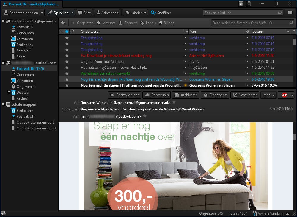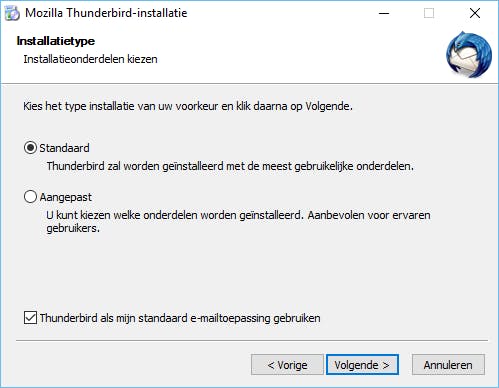 Thunderbird is beschikbaar voor meerdere besturingssystemen, namelijk Windows, OS X en Linux. Surf hiernaartoe om de juiste versie te downloaden en voer de installatie uit. Laat hierbij het vinkje staan voor Thunderbird als mijn standaard e-mailtoepassing gebruiken. Hierdoor opent het programma voortaan automatisch zodra je ergens op een e-mailadres klikt. Je kunt gerust kiezen voor de standaardinstallatie. Via Volgende en Installeren rond je de installatie af. Start de freeware vervolgens op. Lees ook: Zo voeg je extra e-mailaccounts toe in Windows 10 Mail.