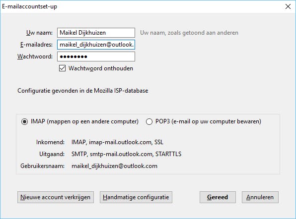 De meeste e-maildiensten en internetproviders ondersteunen tegenwoordig zowel POP3 als IMAP, zoals Gmail, Ziggo, KPN, Outlook.com en Telfort. Helaas kiest Thunderbird niet in alle gevallen automatisch de juiste servers. Zo is het bij e-mailadressen van internetproviders soms nodig de juiste serveradressen zelf in te voeren. Kies voor Handmatige Configuratie, waarna je de inkomende en uitgaande server naar eigen inzicht aanpast. De juiste gegevens vraag je desnoods op bij de internetprovider. Je past daarnaast indien nodig de poortnummers aan. Let goed op of je digitale post via POP3 of IMAP wilt ophalen en bevestig met Gereed.