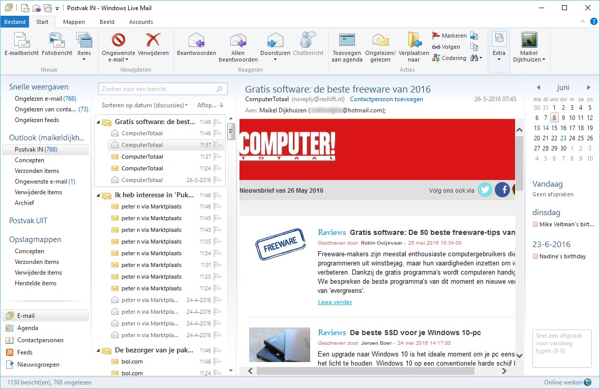 Microsoft werkt Windows Live Mail 2012 al een tijdje niet meer bij. Toch waren er tot voor kort nog een heleboel mensen die deze gratis e-mailclient met plezier gebruikten. Vanaf 30 juni is het niet meer mogelijk om met dit programma e-mails van hotmail-, live-, msn- en outlook-adressen op te halen. Microsofts webmaildienst Outlook.com gebruikt sinds kort namelijk vernieuwde synchronisatietechnieken, waardoor het programma geen berichten van de genoemde domeinen meer kan importeren. Ook verzenden van e-mail is niet meer mogelijk. Overstappen naar een andere e-mailclient is daarom absolute noodzaak wanneer je een e-mailadres van Microsoft gebruikt.