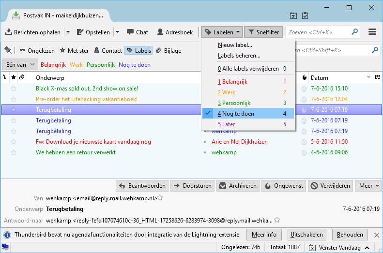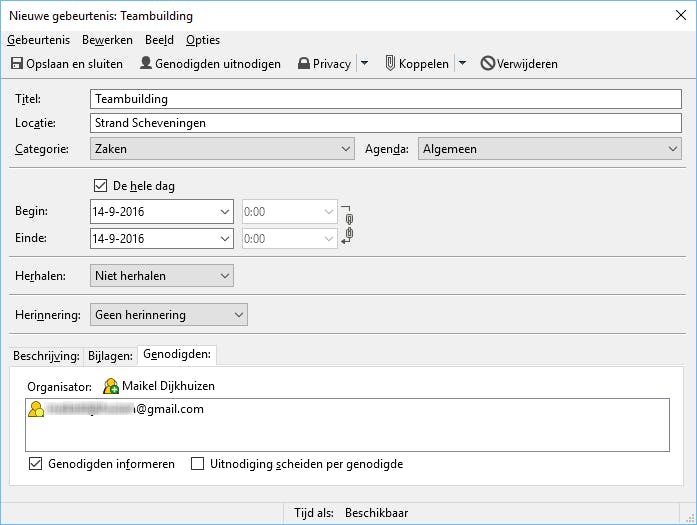 Net als je misschien wel van Windows Live Mail gewend bent, heeft ook Thunderbird een eigen agenda in huis. Zo bekijk je in het rechterdeelvenster welke afspraken er vandaag op de planning staan. Is er geen agenda te zien? Klik rechtsonder dan op Venster Vandaag om dit deelvenster te openen. Via Nieuwe gebeurtenis noteer je eenvoudig een nieuwe afspraak of activiteit. Vul hierbij alle details in, zoals de datum, het tijdstip en de locatie. Handig is om een herinnering in te stellen, zodat je de afspraak niet vergeet. Via Genodigden uitnodigen verstuur je een mailtje met alle agendadetails naar de betreffende contactpersonen. Klik op OK / Opslaan en sluiten.