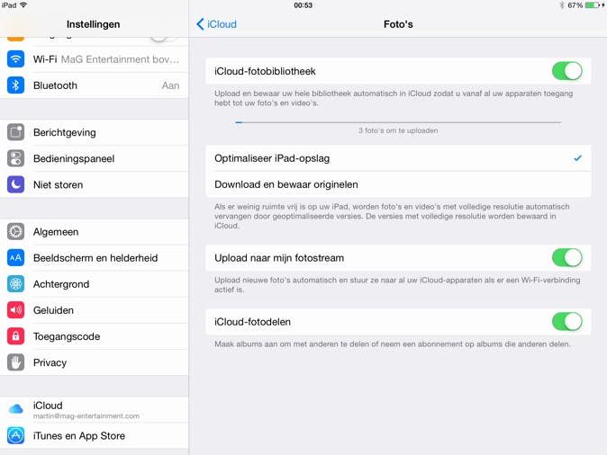 Er is nog een aspect waarin iCloud-fotobibliotheek zich onderscheidt van Fotostream, en het is zonde dat dit onderdeel bijna nooit aandacht krijgt (vooral omdat we denken dat de fotobibliotheek op den duur Fotostream zal gaan vervangen). Het is namelijk nogal dubbelop dat de foto's zowel op je iPad staan als in de iCloud-fotobibliotheek. Apple gaat nog niet zo ver dat de foto's alléén via de iCloud te benaderen zijn, maar biedt wel een prachtige tussenoplossing. Wanneer je iCloud-fotobibliotheek hebt ingeschakeld (in iCloud / Foto's), verschijnt er een extra optie, genaamd Optimaliseer iPad-opslag. Wanneer je deze optie inschakelt, worden de originele foto's in hoge resolutie bewaard in iCloud, en worden alleen geoptimaliseerde versies bewaard op het apparaat (of de apparaten) zelf. Dat is ideaal, want zo kun je je foto's gewoon nog bekijken op de iPad, zonder dat dit direct kostbare MB's van je opslagruimte op het apparaat opslokt. Heb je een versie in hoge resolutie nodig, dan kun je die eenvoudig downloaden vanuit je fotobibliotheek.