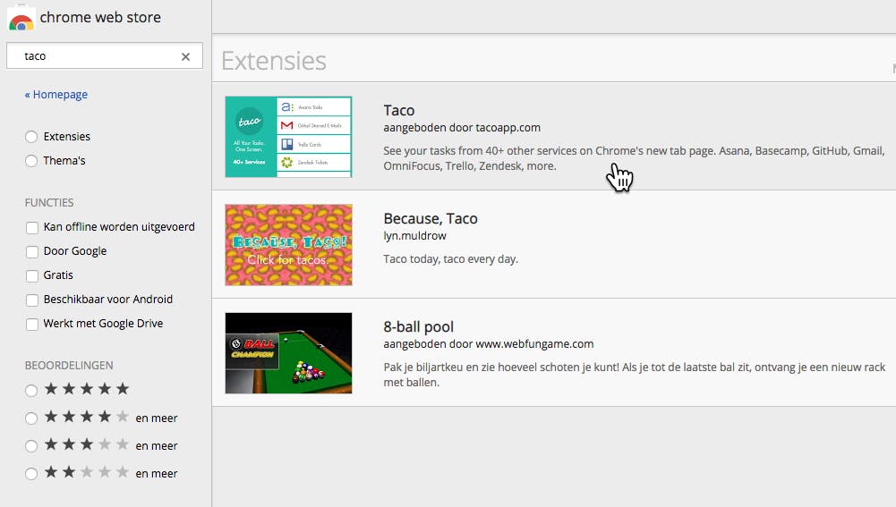 Taco is een gratis browserextensie voor Google Chrome. Om het programmaatje te installeren, open je je browser en surf je hiernaartoe. Links bovenaan in de zoekbalk typ je ‘Taco’. Er verschijnen meerdere resultaten. Ga naar de app die wordt aangeboden door tacoapp.com en klik op Toevoegen aan Chrome. Ga verder met Extensie toevoegen. Enkele ogenblikken later krijg je de melding dat de extensie geïnstalleerd is. Helemaal rechts bovenaan in de adresbalk van je browser verschijnt een extra icoontje met de letter t.