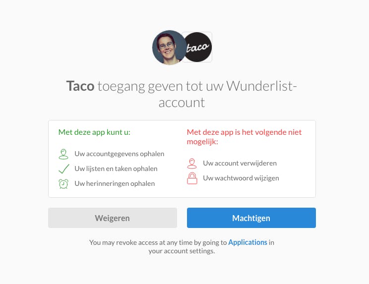 Om de extensie te gebruiken, moet je ‘m uiteraard eerst instellen. Hiervoor klik je op het net toegevoegde icoontje met de t. In het menu kies je Taco waarna je een overzicht ziet van alle mogelijke takenlijstservices die Taco ondersteunt. Hier zitten heel wat grote namen bij. Dat is de troef van Taco. Het volstaat om op de takenlijstmanager(s) te klikken die je gebruikt en vervolgens word je doorgestuurd naar de desbetreffende dienst. Zodra je daar bent ingelogd met je e-mailadres en wachtwoord hoef je alleen nog maar te autoriseren met de Machtigen-knop.