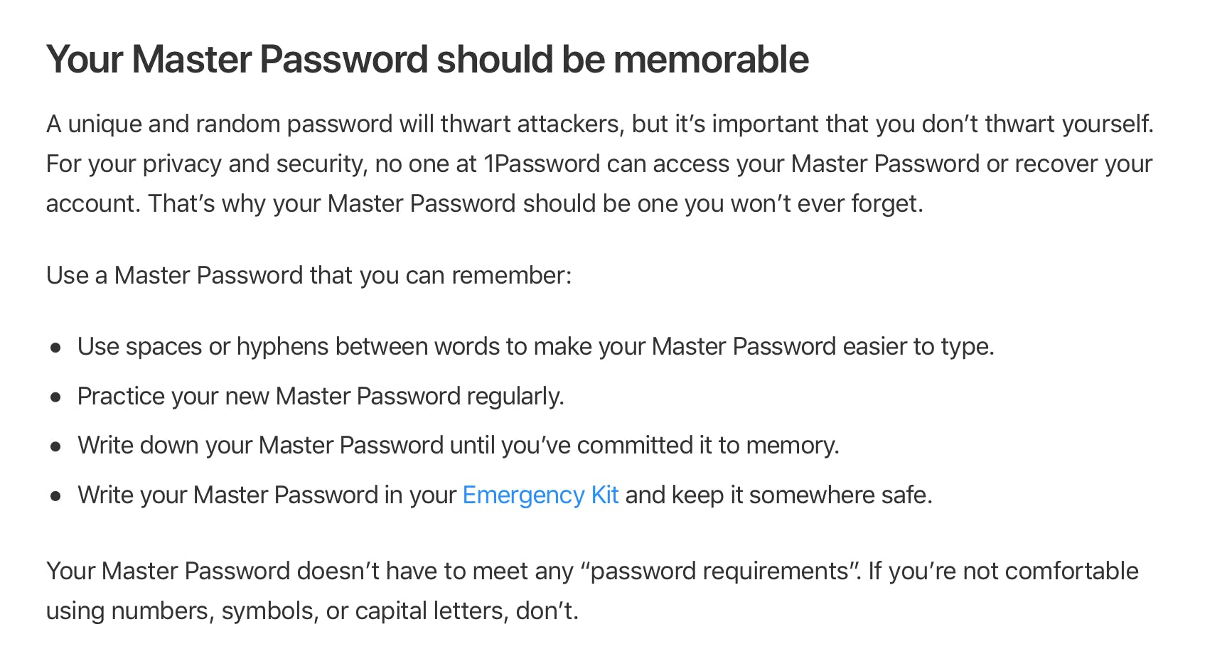 Denk goed na over je hoofdwachtwoord of Master Password. Dit wachtwoord mag niet te makkelijk te raden zijn, maar moet wel door jou te onthouden zijn omdat het je sleutel is tot al je wachtwoorden. Een slimme tip is om een lang wachtwoord met een combinatie van woorden, cijfers en tekens te gebruiken. Kies bijvoorbeeld drie willekeurige woorden uit een online woordenlijst, combineer dit met een cijfer plus teken en kies daarnaast nog de naam van bijvoorbeeld je huisdier, maar dan geschreven met andere karakters. Mix de vijf elementen, zet er streepjes of spaties tussen en je hebt een vrij sterk wachtwoord. Een resultaat zou bijvoorbeeld kunnen zijn: boomhut-N3R0-ventilator-257%-tuesday. Moeilijk genoeg als wachtwoord, maar toch makkelijk te onthouden.