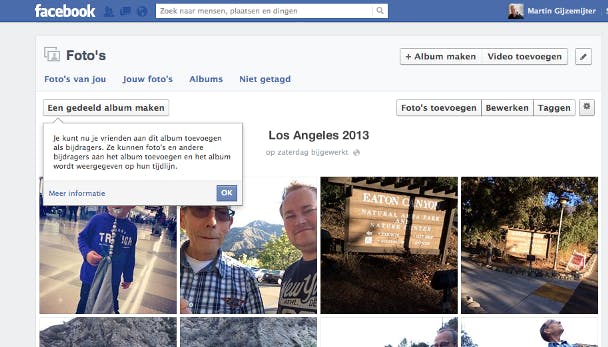 Je hebt nu een album aangemaakt, maar op dit moment ben jij nog de enige die daar foto's aan kan toevoegen. Je kunt dat veranderen door het album te delen. Klik op je profiel en vervolgens op Foto's. Klik nu op het kopje Albums en daarna op het album dat je wilt delen. Linksboven verschijnt nu de optie Een gedeeld album maken. Wanneer je hierop klikt, kun je aangeven welke mensen foto's mogen uploaden naar het album.