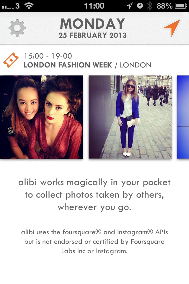 Met Alibi kun je een fotoalbum vullen met vakantiefoto's, zonder dat je zelf ook maar één foto hoeft te maken. Als je de app aan het werk zet zal deze, terwijl je ergens rondloopt, automatisch foto's van internet halen door de sociale netwerken Instagram en Foursquare af te speuren. De app blijft op de achtergrond actief, maar verbruikt daardoor natuurlijk wel data (wat niet handig is in het buitenland). En door de gps-activiteit gaat je batterij ook wat sneller leeg. Het levert echter wel aardig wat foto’s op, want de kans is groot dat iemand anders al een mooie foto heeft gemaakt in de buurt van diezelfde locatie. De locaties waar je bent geweest kun je in een soort tijdlijn terugvinden, met per locatie een serie foto's. Een leuk idee, maar de app kent verder nauwelijks opties. Wat wel leuk kan zijn, is dat je via Instagram in contact kunt komen met mensen die de foto’s hebben gemaakt.
