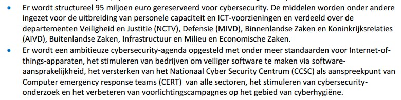 Er komt sowieso op veel vlakken meer geld voor cybersecurity. In totaal wordt 95 miljoen euro uitgetrokken voor meer en beter personeel in verschillende velden, en er wordt geïnvesteerd in betere apparatuur.