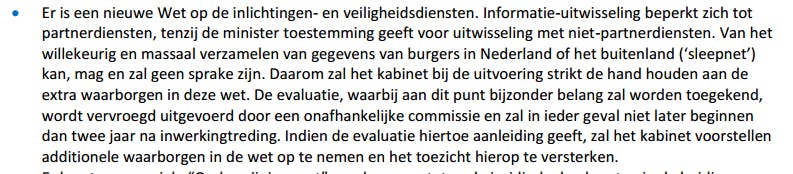 In het nieuwe regeerakkoord staan meer details over de WiV. De 4 regeringspartijen zeggen zelf dat de wet niet mag leiden tot een 'sleepnet'. "Van het willekeurig en massaal verzamelen van gegevens van burgers in Nederland of het buitenland (‘sleepnet’) kan, mag en zal geen sprake zijn", staat in het document te lezen. In het akkoord staan dan ook een aantal waarborgen om de wet te handhaven en te zorgen dat die niet uit de hand loopt.