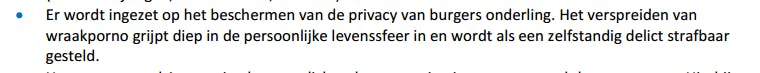 De toekomstige regering wil wraakporno strafbaar maken. Dat is het nu ook al wel, maar niet als op zichzelf staande veroordeling. Nu wordt het verspreiden van wraakporno vaak nog gezien als bijvoorbeeld afpersing, stalking, of laster, maar de regering wil het een zelfstandig delict maken. Wat de sancties zijn is nog niet bekend.