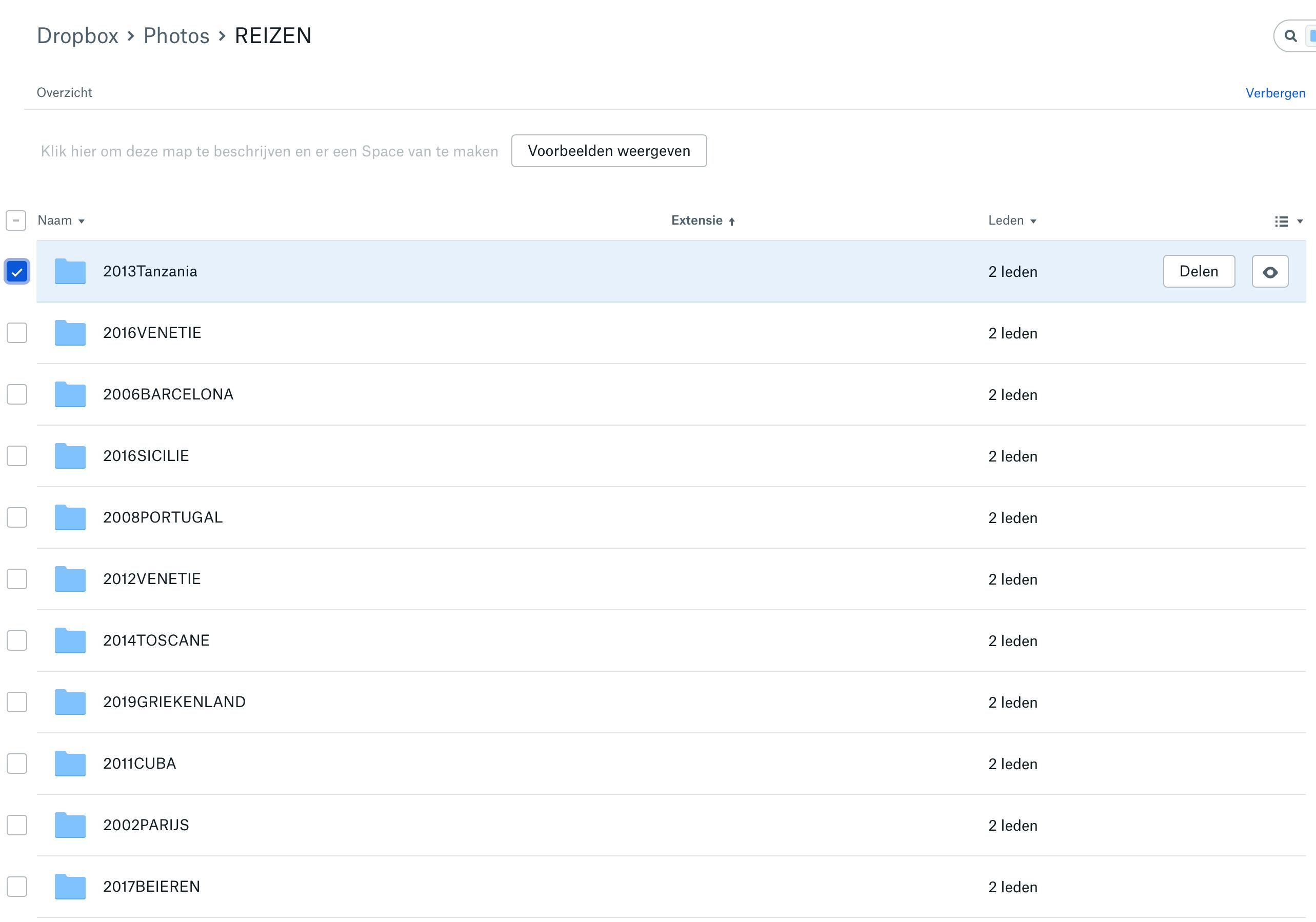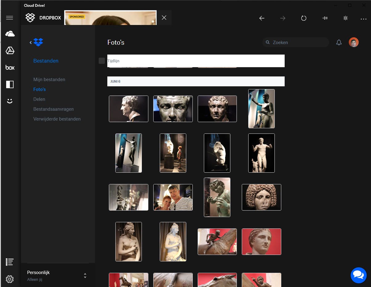 In de webversie van Dropbox staat links ook de knop Foto’s die alle fotobestanden op een tijdlijn plaatst en deze groepeert per dag. Dat klinkt goed, maar als je door de lijst scrolt, zul je merken dat er veel foto’s bij staan die jij zelf nooit hebt opgeslagen. Dat voorval doet zich voor wanneer Dropbox een map synchroniseert waarin bijvoorbeeld schermafbeeldingen of illustraties van een grafisch ontwerp zitten. Ook die beelden zullen dan in de lijst van Foto’s verschijnen. Zo gebeurde het bij ons dat alle portretfoto’s van een collega uit een personeelslijst op deze manier tussen onze persoonlijke foto’s zijn geraakt.