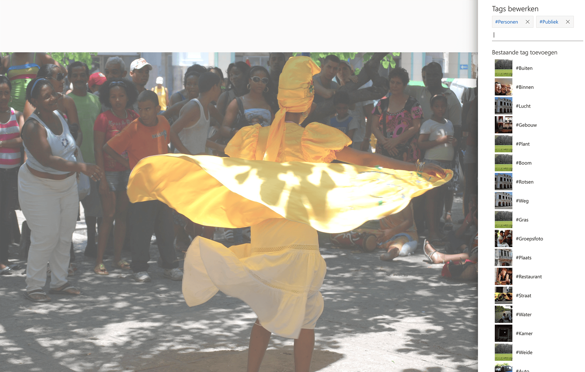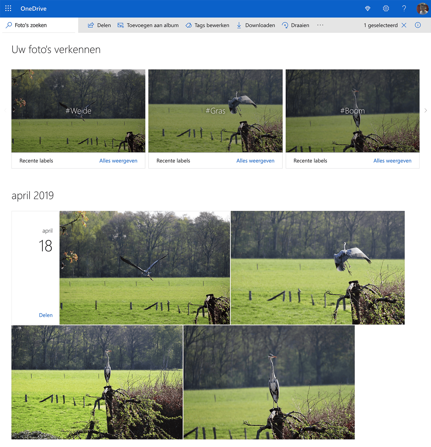 Tags zijn bijzonder handig om later een foto snel terug te vinden. De voorstellen voor trefwoorden worden voorafgegaan door een hashtag. Wanneer je op de knop Tags klikt, zie je alle trefwoorden die OneDrive voorstelt. Door op een foto te klikken, wordt de albumweergave geopend. Rechtsboven staat een rond pictogram met een i om de informatie over de foto te openen. Selecteer de foto’s waarvan je de trefwoorden wilt aanpassen en klik dan bovenaan op de knop Tags bewerken. Nu kun je je eigen trefwoorden toevoegen of een of meerdere tags aan de foto(’s) toevoegen die OneDrive zelf voorstelt.