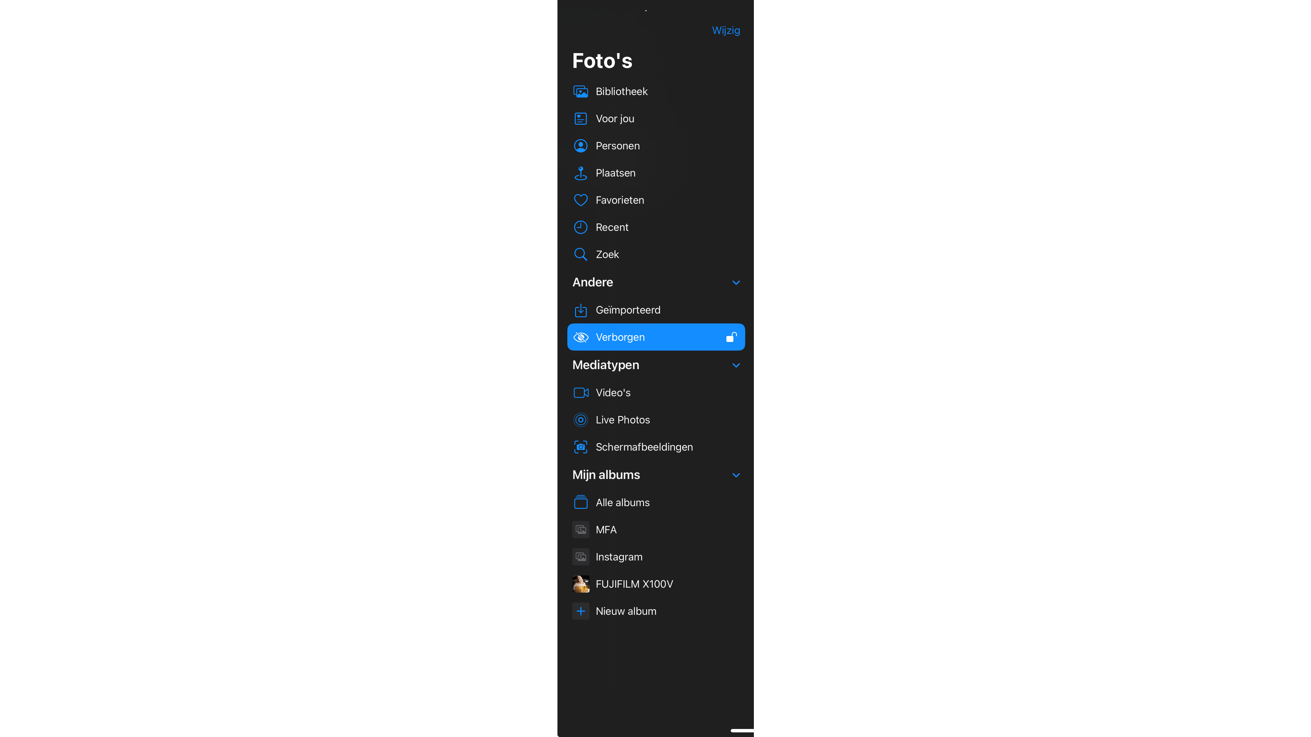 Mogelijk vind je het niet prettig dat de map Verborgen continu zichtbaar is in de gebruikersomgeving. Gelukkig kun je de vergrendelde map verbergen. Open de instellingen van iOS en kies Foto’s. Zet de schuif op Uit bij Toon verborgen album. Op een Mac is dit andersom: hierbij wordt de map standaard niet getoond, tenzij je deze via het instellingenvenster voor Foto’s weer zichtbaar maakt.