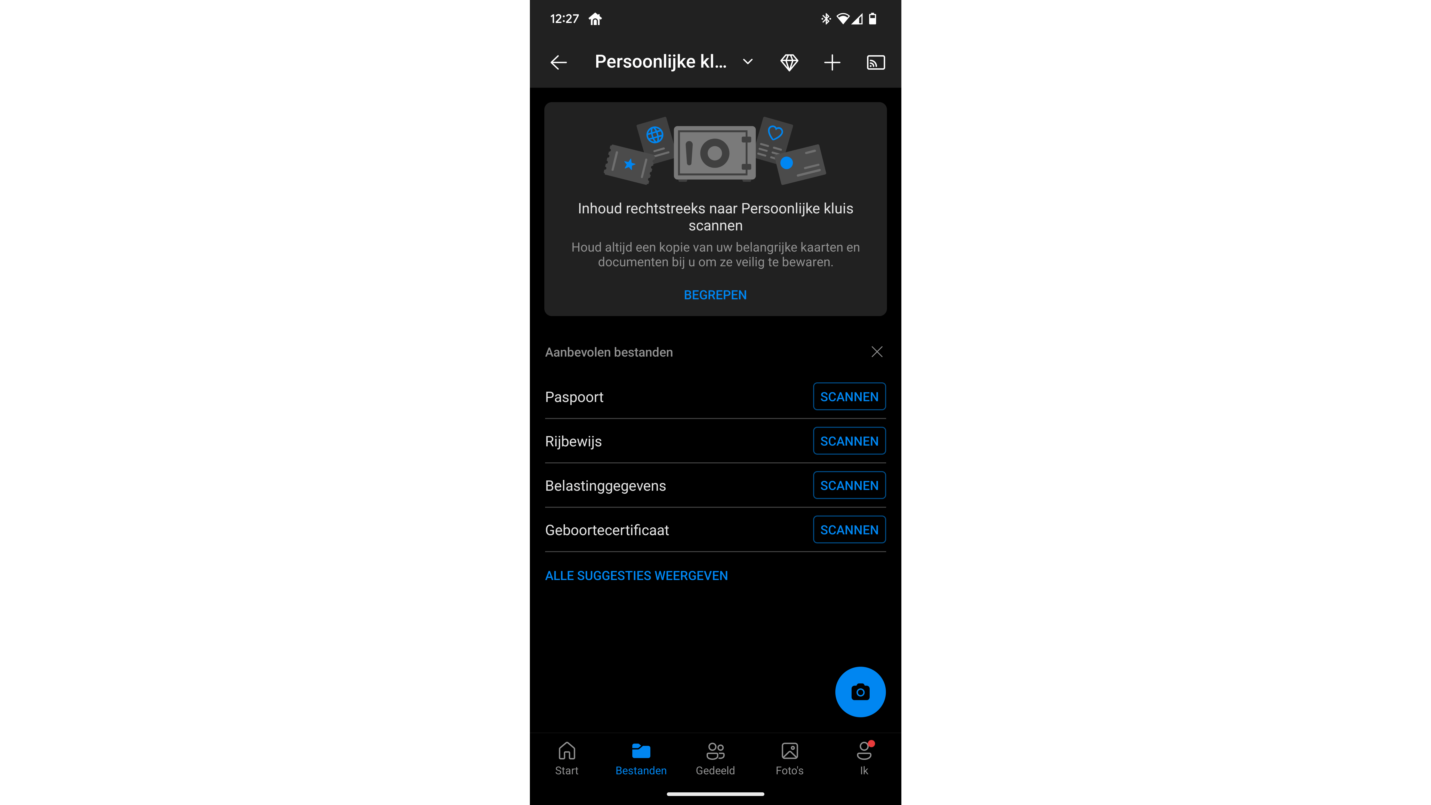 Via je telefoon kun je snel belangrijke persoonlijke documenten – zoals paspoort en rijbewijs – scannen en opslaan in de kluis. In het hoofdscherm van Persoonlijke kluis vind je een overzicht van aanbevolen bestanden. Tik op Scannen bij een document om het vast te leggen. De lijst met suggesties is groter dan standaard wordt getoond. Tik op Alle suggesties weergeven om de volledige lijst te zien. Maak je gebruik van de gratis versie van OneDrive, dan kun je maximaal drie bestanden in de vergrendelde map plaatsen. Bij de betaalde versie van de opslagdienst is er geen limiet.