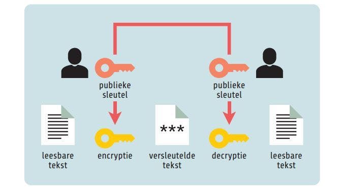 Het idee van asymmetrische encryptie kreeg vorm in de jaren zeventig van vorige eeuw in de Diffie-Helman-sleuteluitwisseling, gevolgd door het nog complexere RSA-encryptiealgoritme. Bij deze vorm van encryptie horen twee verschillende sleutels: een geheime of privésleutel en een publieke sleutel die zuit handen mag worden gegeven. Dat kan doordat uit deze publieke sleutel de privésleutel niet kan worden afgeleid, terwijl het omgekeerde wel het geval is.