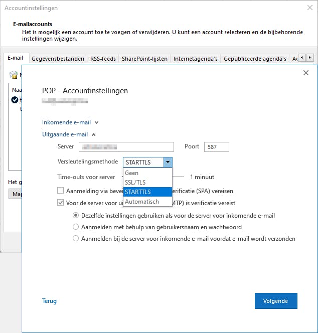 Je moet uiteraard wel je mailclient correct configureren. Om bijvoorbeeld in Microsoft Outlook na te gaan welk versleutelingsmechanisme wordt gebruikt, ga je naar Bestand / Accountinstellingen / Accountinstellingen, selecteer je een account, klik je op Herstellen / Geavanceerde opties en plaats je een vinkje bij Ik wil mijn account handmatig herstellen. Klik vervolgens op Repareren en controleer de instellingen bij Uitgaande e-mail.