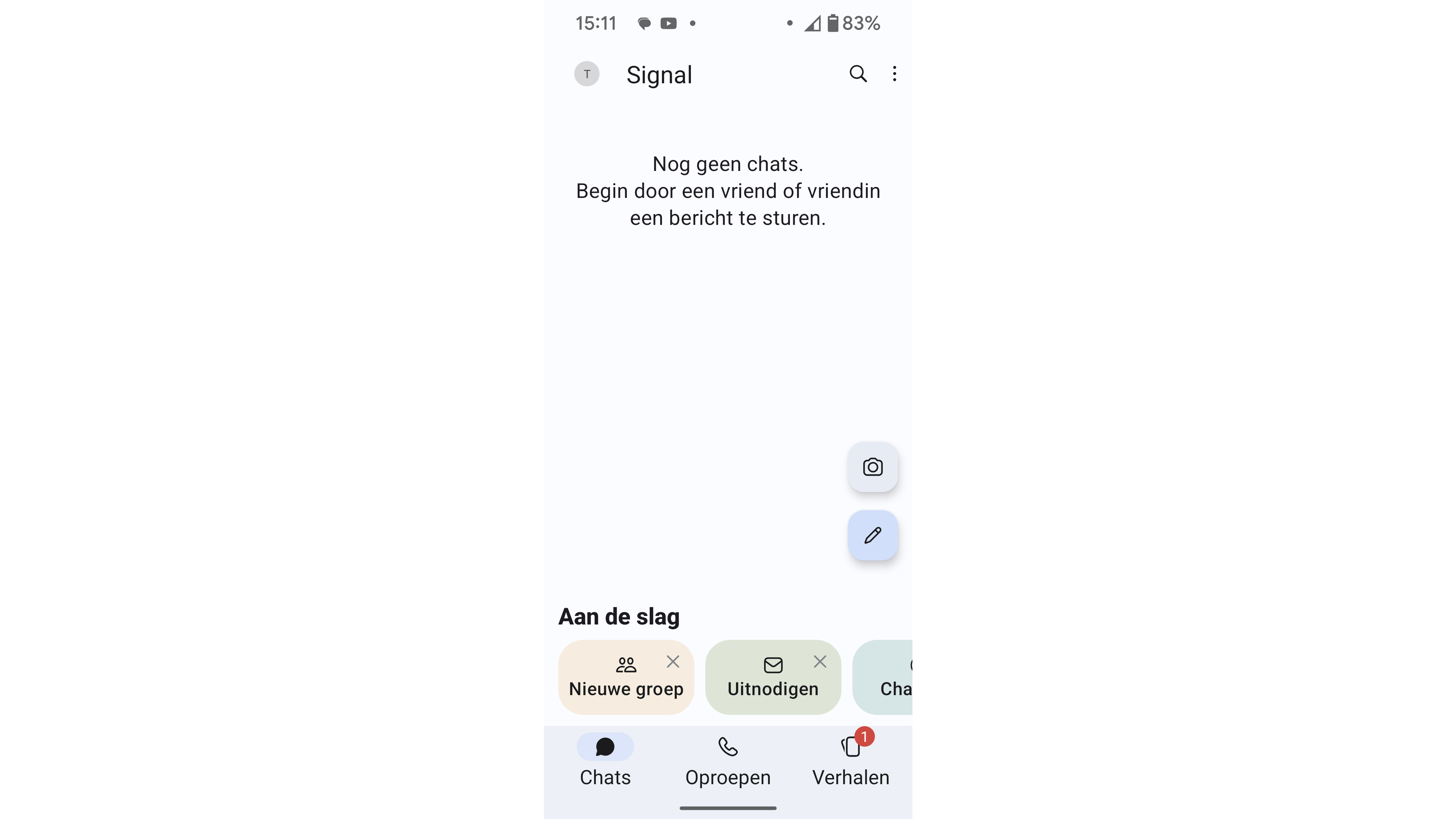 Tik op het pen-pictogram en controleer of Signal al contacten heeft gevonden die de app gebruiken. Je kunt hen direct een bericht sturen. Bij Instellingen / Meldingen kun je eventueel de optie inschakelen Geef me een melding wanneer een telefooncontact vanaf nu ook op Signal bereikbaar is.