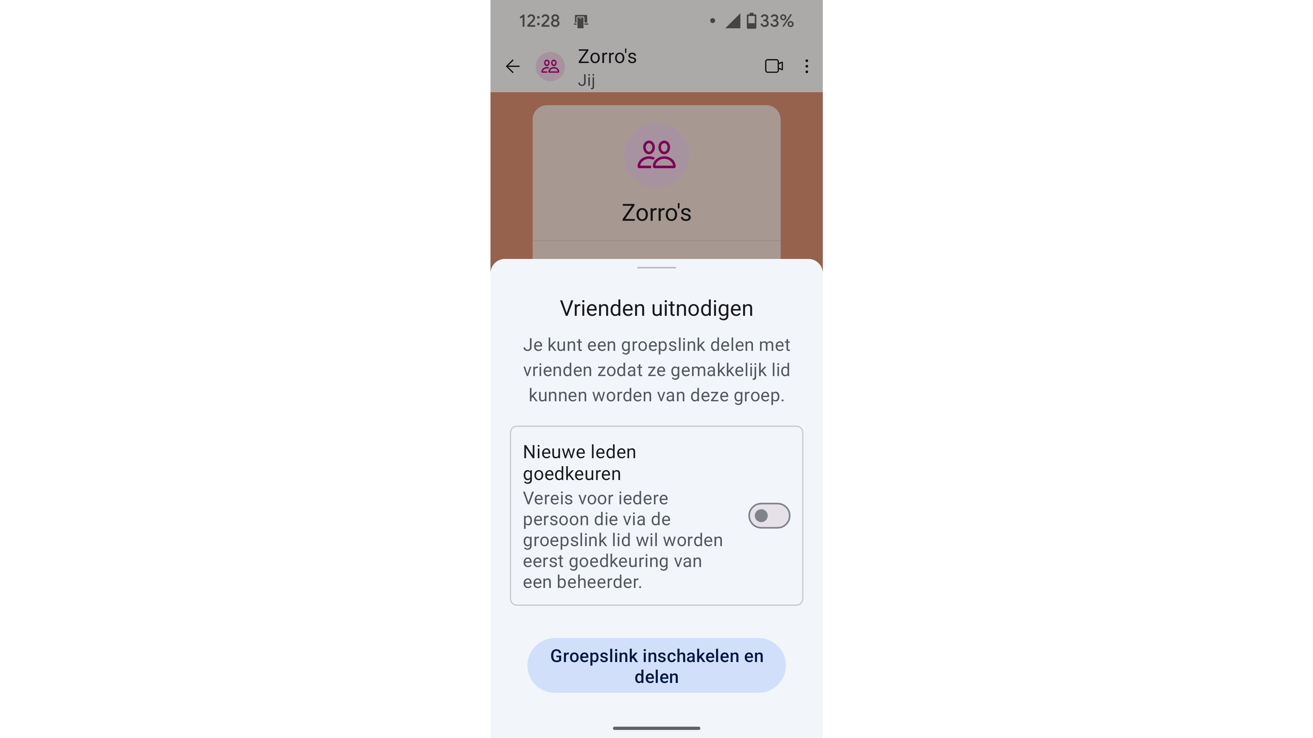 Je krijgt vervolgens de optie om een groepslink aan te maken. Zet het vinkje uit bij Nieuwe leden goedkeuren, zodat iedereen met de link direct kan deelnemen. Deel deze link in de oude WhatsApp-groep. Zodra alle leden in de nieuwe groep zitten, kun je de oude groep afsluiten.