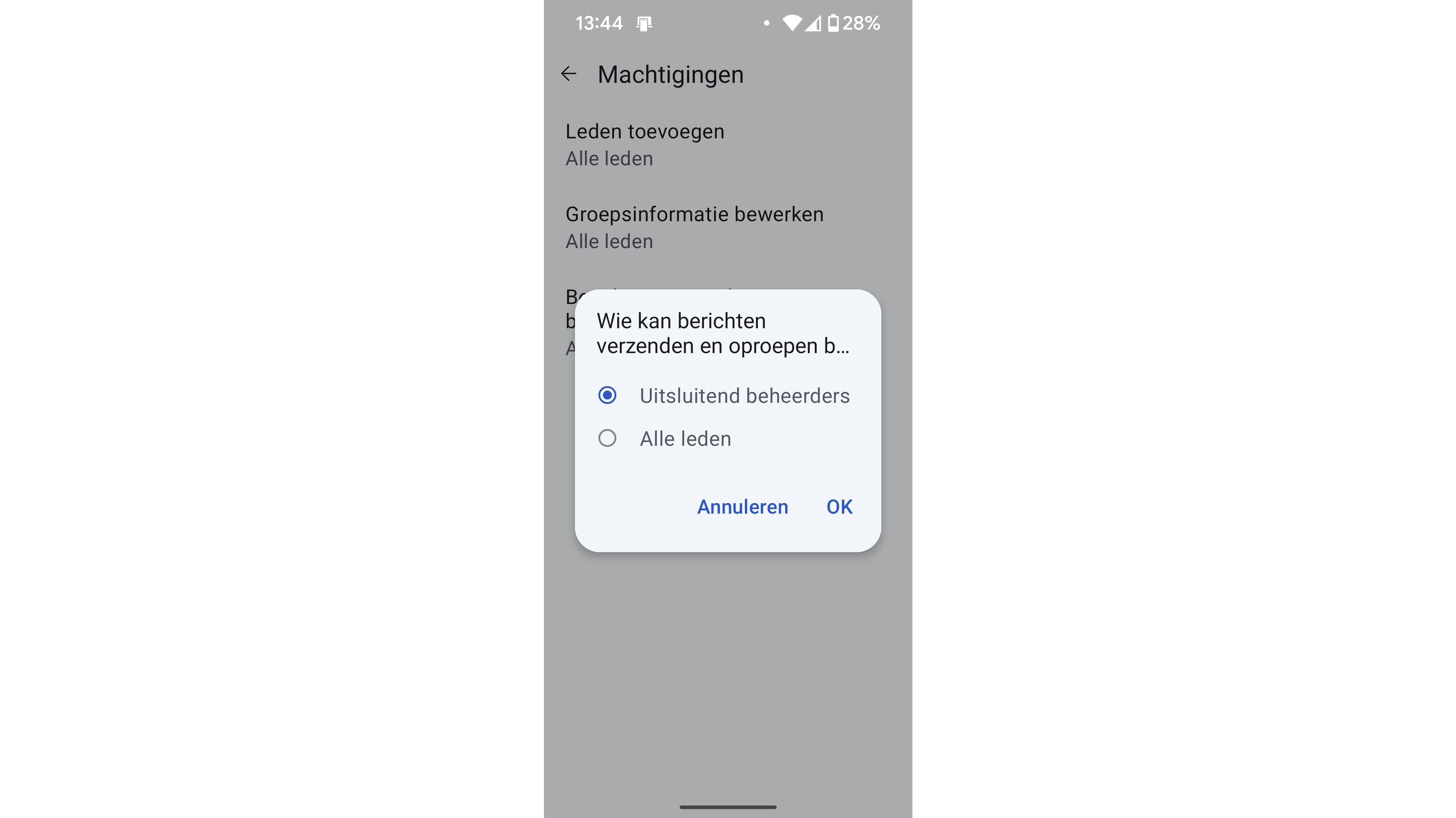 Een andere methode is een groep aanmaken en de machtigingen zo instellen dat alleen beheerders berichten kunnen verzenden. Groepsleden kunnen niet reageren, behalve met emoji’s. Om de machtigingen aan te passen, tik je op de groepsnaam en vervolgens op het knopje met de drie stippen. Kies Groepsinstellingen en open Machtigingen. Selecteer Berichten verzenden & oproepen beginnen en kies Uitsluitend beheerders.