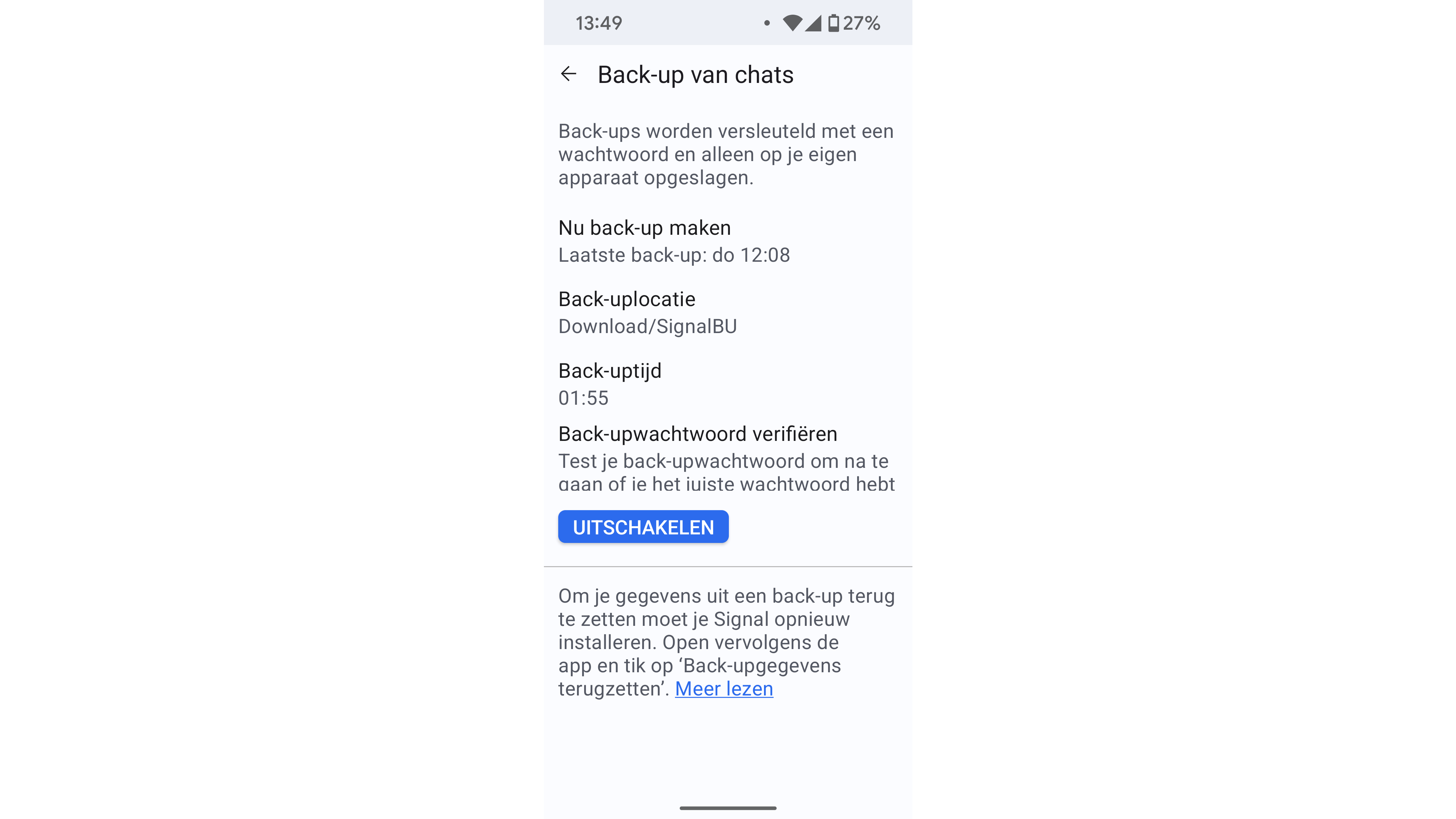 Om de back-up terug te zetten, installeer je Signal opnieuw, kies je Account overzetten of herstellen en volg je de instructies.