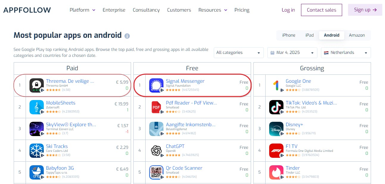 Signal loopt qua gebruikersaantal nog ver achter, maar maakt een sterke inhaalbeweging. In Nederland is het begin maart 2025 zelfs de meest gedownloade gratis Android- en iPhone-app, terwijl WhatsApp op de zeventiende plaats staat. Opvallend is ook dat Threema, een andere messenger, momenteel de populairste betaalde Android-app is.