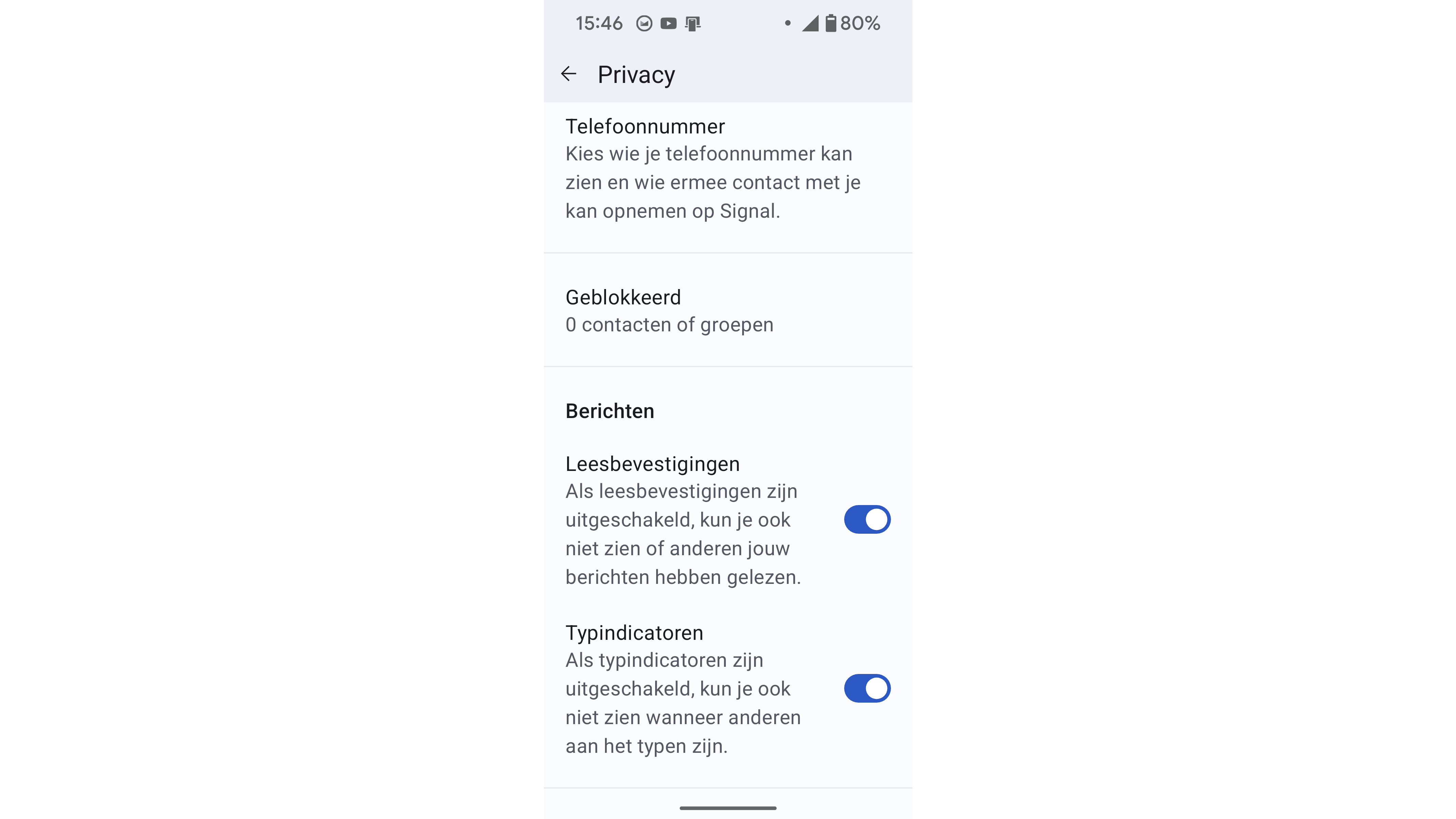 Een enkel vinkje bij een verstuurd chatbericht betekent dat het succesvol naar de Signal-server is verzonden, terwijl twee vinkjes aangeven dat het op het apparaat van de ontvanger is afgeleverd. Heb je bij Instellingen / Privacy de optie Leesbevestigingen ingeschakeld, dan worden de vinkjes bij de verzender grijs ingekleurd zodra je het bericht hebt gelezen. Zonder deze optie zie je zelf ook niet of anderen jouw berichten hebben gelezen. Het is overigens ook mogelijk om (standaard versleutelde) spraak- en video-oproepen te doen, zowel één-op-één als in groepsverband.