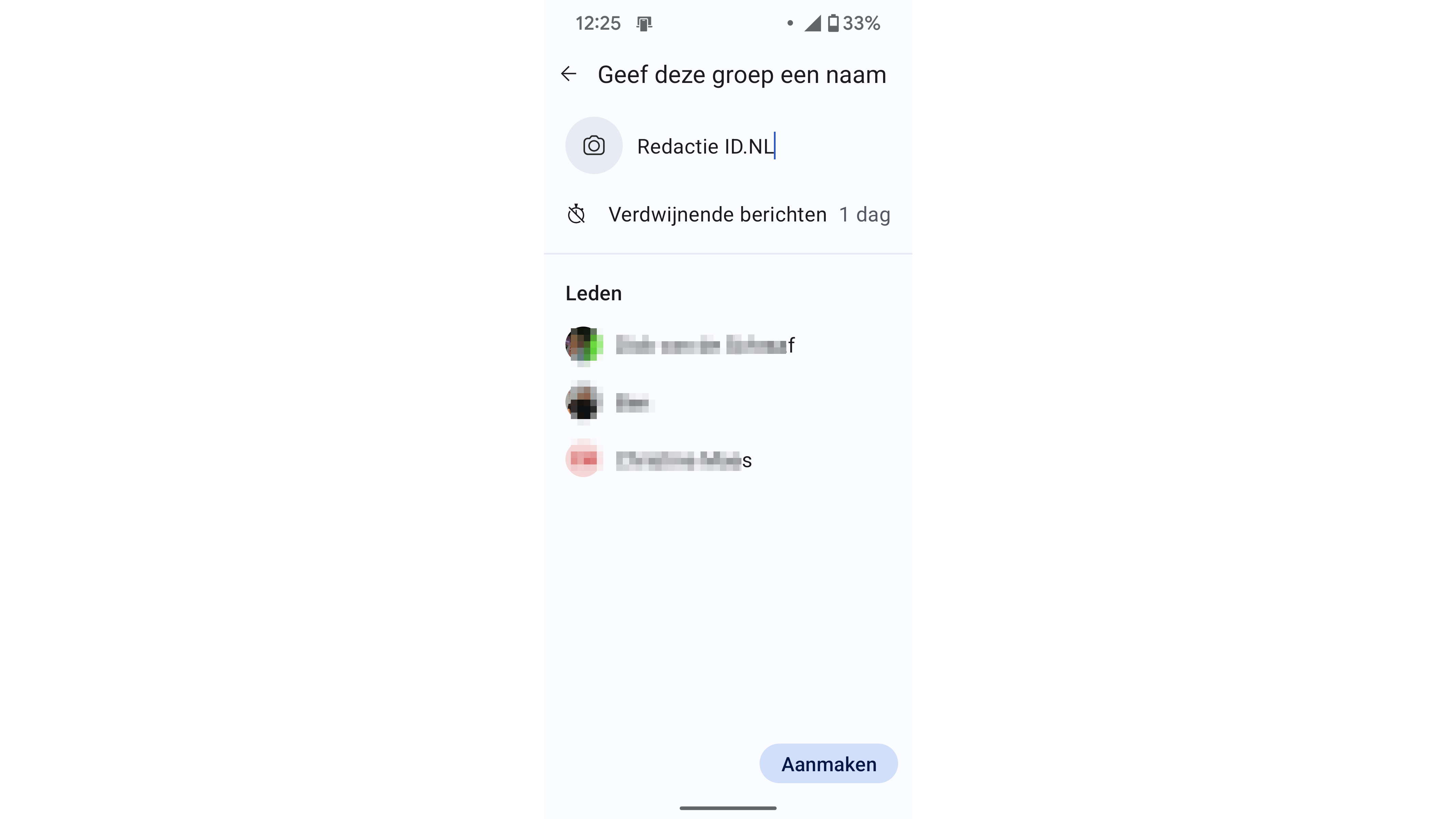 De groep verschijnt direct in je chatlijst en die van de groepsleden. Afhankelijk van hun instellingen moeten sommige leden mogelijk eerst een uitnodiging accepteren voor ze berichten kunnen sturen. Een klok-pictogram geeft aan dat een bericht verdwijnt.