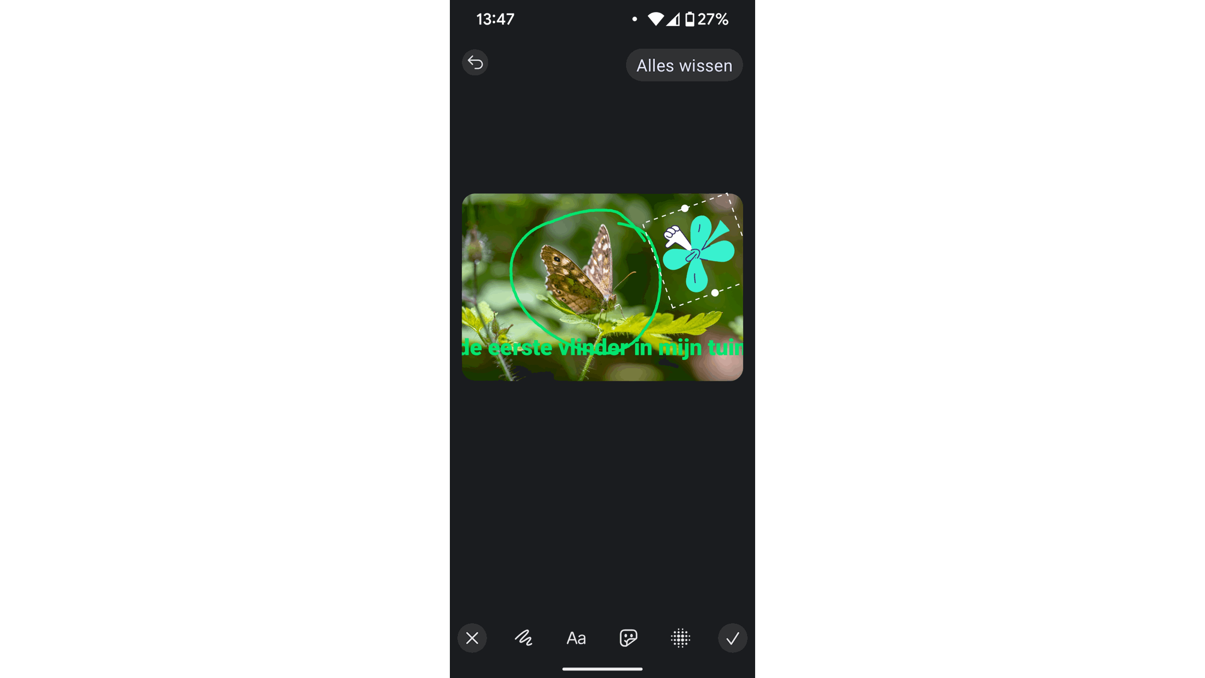 Na het selecteren van een mediabestand verschijnt een bewerkingsscherm met tools om de afbeelding bij te snijden, te roteren, tekst toe te voegen, stickers en emoji’s te plaatsen, met je vinger te tekenen in een zelf gekozen kleur of delen wazig te maken.