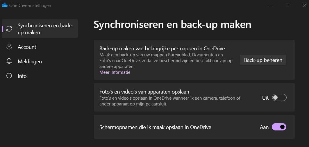 Het is ook mogelijk om de afbeeldingsbestanden die je maakt met de PrtScn-toets automatisch op te slaan in OneDrive. Om deze methode te gebruiken, klik je met de rechtermuisknop op het cloudpictogram van OneDrive aan de rechterkant van de taakbalk. Kies Instellingen en ga dan naar het tabblad Synchroniseren en back-up maken. Daar activeer je de optie Screenshots opslaan die ik vastleg op OneDrive. Het afbeeldingsbestand in de png-indeling komt dan in de map OneDrive/ gebruikersnaam /Pictures/Screenshots. De bestandsnaam gebruikt de huidige datum en tijd.