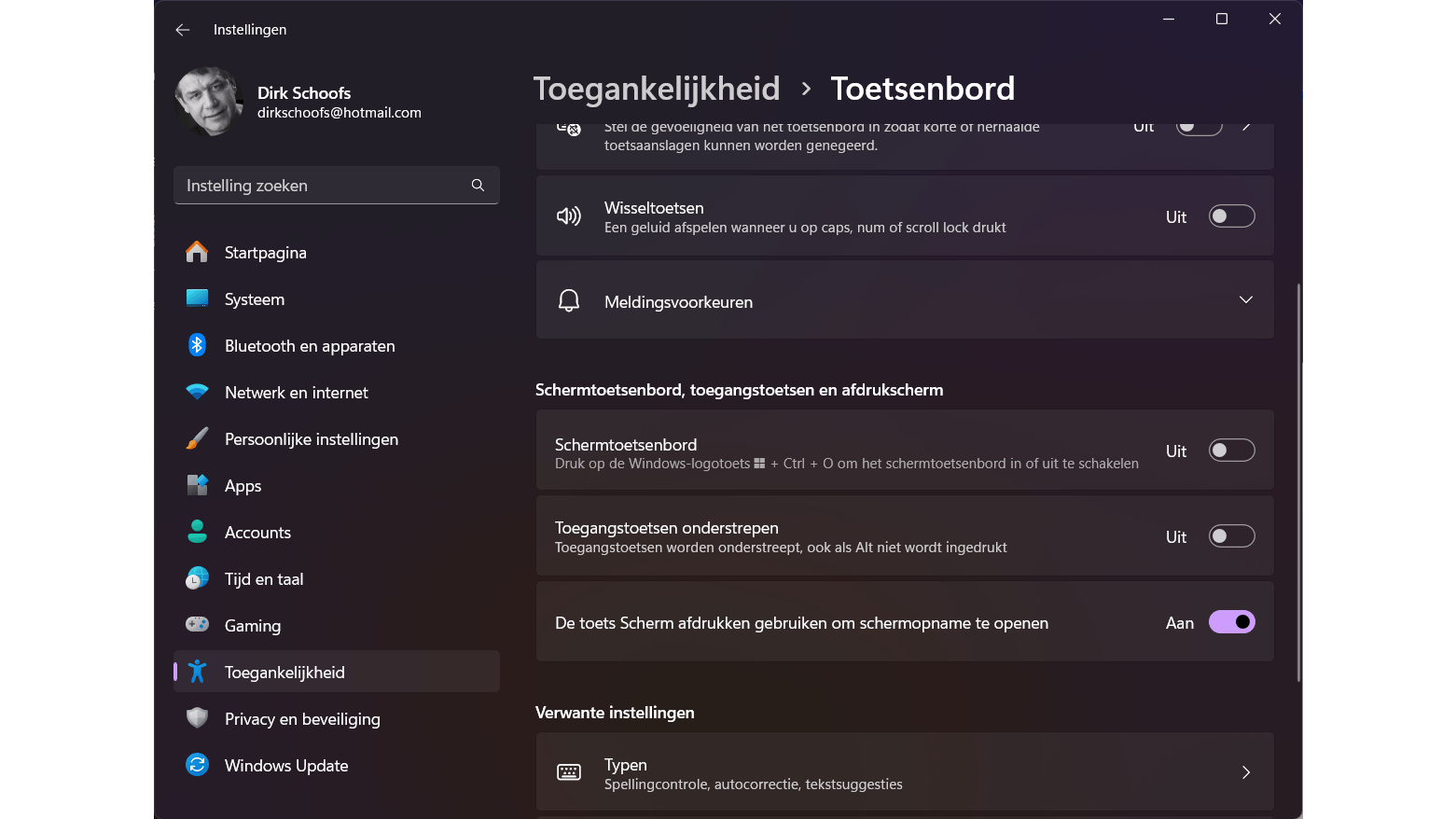 Open je het selectiemenu van het Knipprogramma liever met de PrtScn-toets dan de Windows-toets+Shift+S? open dan met Windows-toets+I de Instellingen en navigeer dan naar Toegankelijkheid / Toetsenbord. Zet de tuimelschakelaar aan bij De toets Scherm afdrukken gebruiken om schermopname te openen. Om een schermafdruk van het actieve venster naar het klembord te maken, gebruik je de combinatie Alt+PrtScn. Dat is handig als met meerdere beeldschermen werkt.