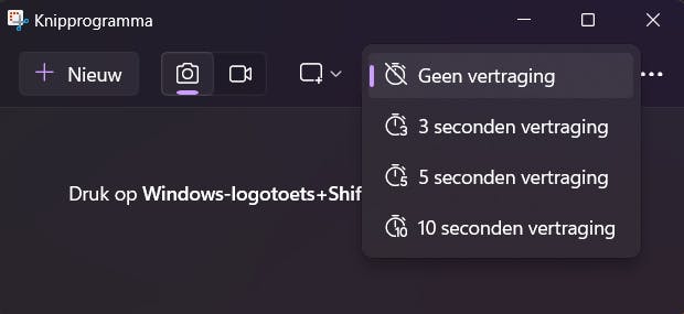 Om een schermopname te maken met het Knipprogramma klik je op het pictogram van het fototoestel. Heb je nog even tijd nodig om bijvoorbeeld een bepaald programma te openen, dan kun je enkele seconden vertraging inbouwen. Klik op het pictogram met het klokje en bepaal dan of de knipfunctie 3, 5 of 10 seconden later moet starten.