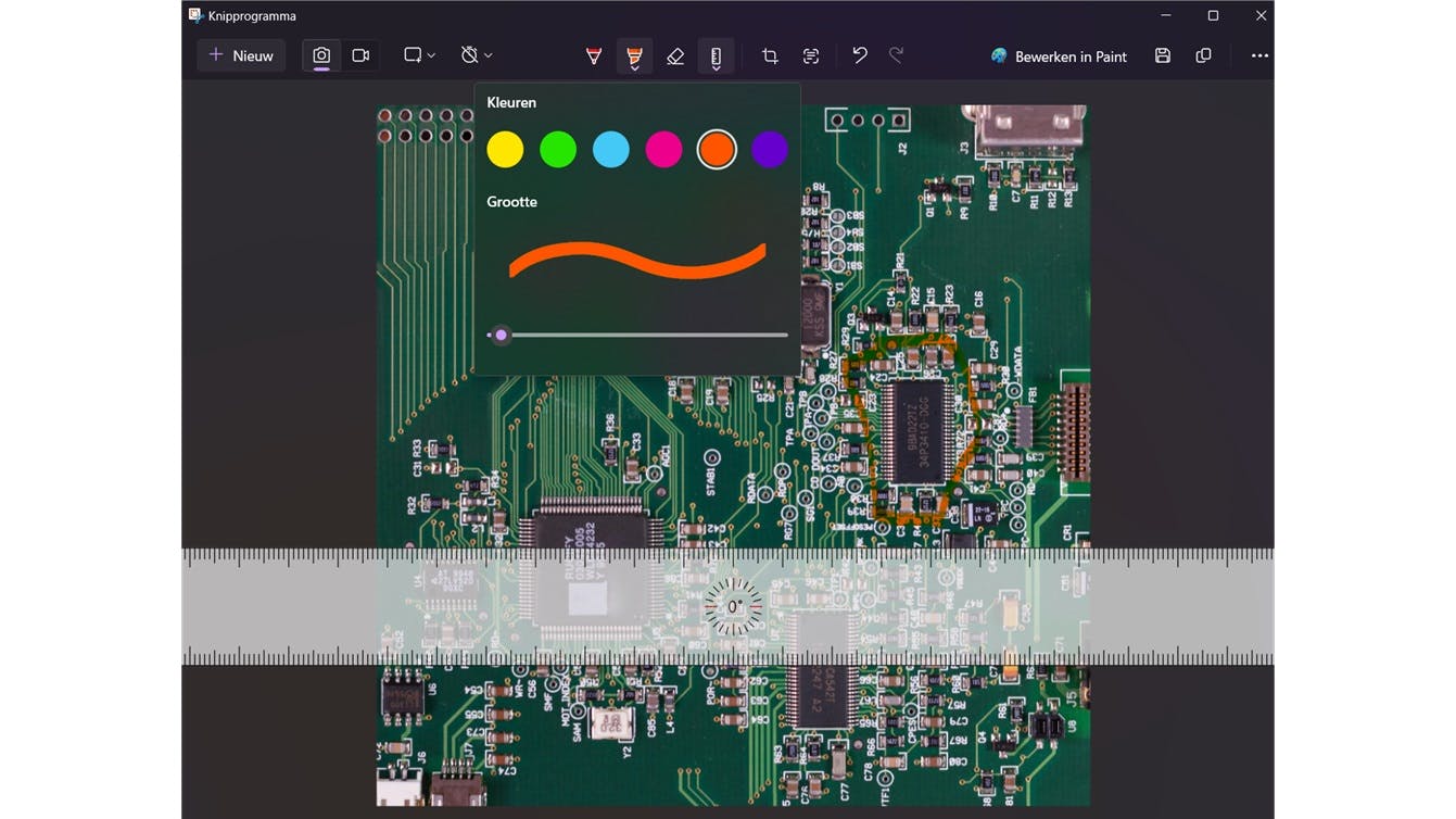 Als het knipsel geopend is, zie je de knoppen om de afbeelding te bewerken. Je kunt handmatig met de muis of de trackpad iets schrijven op het knipsel in elke kleur. Met de markeerstift markeer je onderdelen. De lijn van de markeerstift is een beetje transparant. Er is een gummetje om aantekeningen of markeringen te verwijderen. Met de liniaal trek je een rechte lijn op het knipsel. Die liniaal roteert via het muiswieltje. Klik nog een keer op deze knop en dan verandert deze tool in een gradenboog.