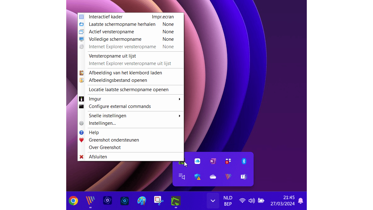 Na de installatie tref je het programmapictogram rechtsonder aan in het systeemvak van de taakbalk. Het kan verborgen zijn achter het pijltje. Klik er met de rechtermuisknop op en open de Voorkeursinstellingen van het programma. Hier kun je de sneltoetsen vastleggen voor de verschillende typen schermopnamen.