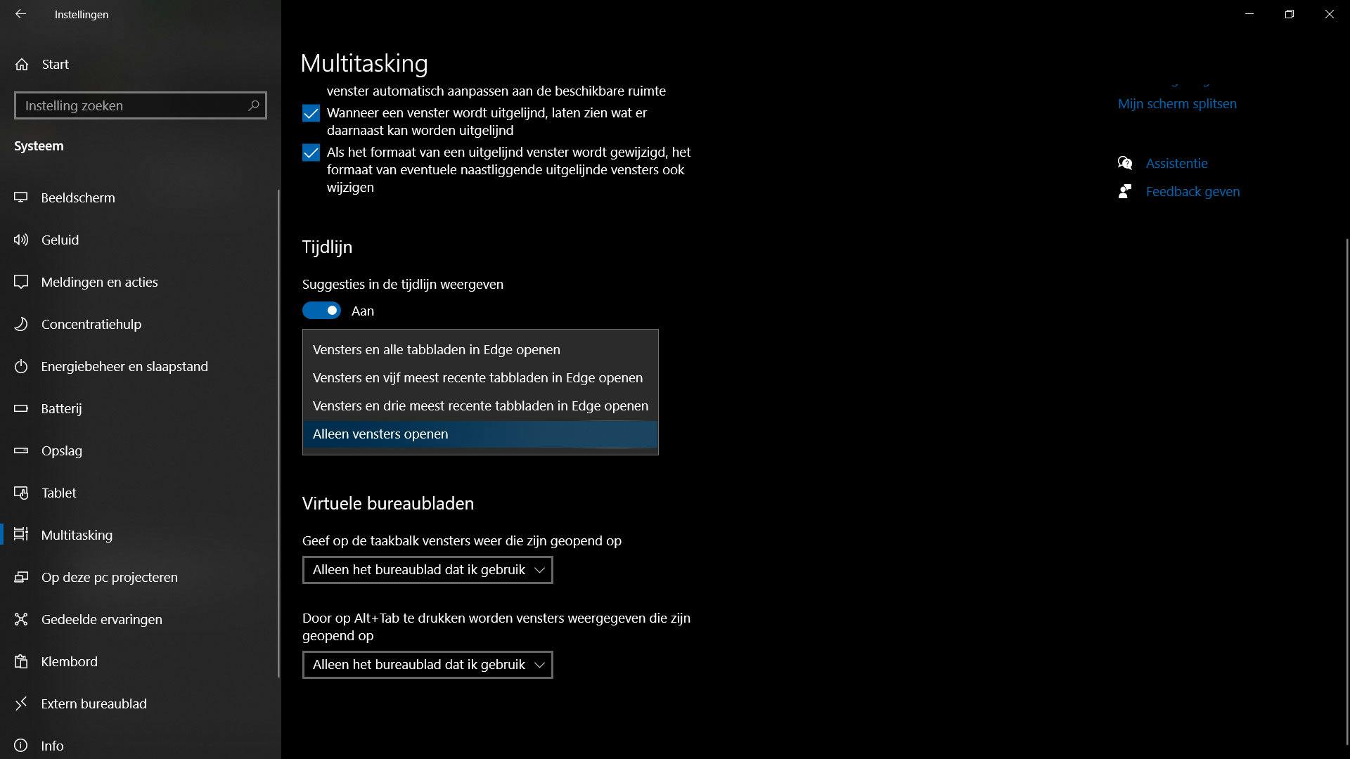 Het Alt + Tab-venster aanpassen kan met ingebakken Windows-opties en middels een extern programma. Voordat we dat programma behandelen, kijken we eerst naar die standaardopties. Je gaat hiervoor naar Instellingen > Systeem > Multitasking (die optie staat links in het menu). Op deze pagina staat bijna onderaan het kopje Alt + Tab.