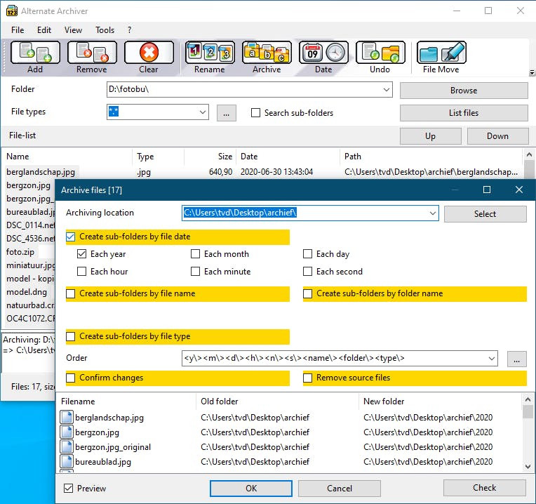 Beginnen we onze verkenning met de ‘archiveringsfunctie’. Zodra je data hebt toegevoegd, kun je die in principe met één druk op de knop in een archiefbestand plaatsen. Standaard gaat het dan om een simpele kopieer- of verplaatsingsoperatie, tenzij je een van de opties selecteert waarmee je de bestanden automatisch kunt laten herschikken in diverse submappen, op basis van datum, naam of type. Kies je bijvoorbeeld voor een herordening op basis van datum, dan kan dat volgens jaar, maand, dag, uur, minuut of zelfs seconde. Een handige voorbeeldweergave geeft meteen weer welk resultaat je mag verwachten.