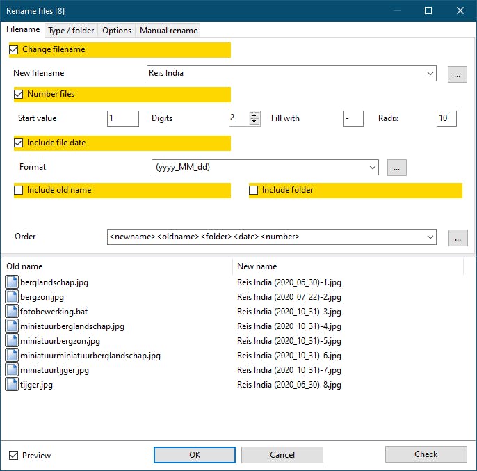 Zo kun je bestanden laten nummeren, inclusief opvultekens, of je laat de datum of de oude bestandsnaam of mapnaam mee opnemen. Je kiest ook zelf de volgorde van deze naamonderdelen. Op afzonderlijke tabbladen kun je bovendien de extensie aanpassen, tekens weghalen of vervangen, en hoofd- en kleine letters regelen. Een voorbeeldweergave toont je ook hier of alles er goed uitziet.