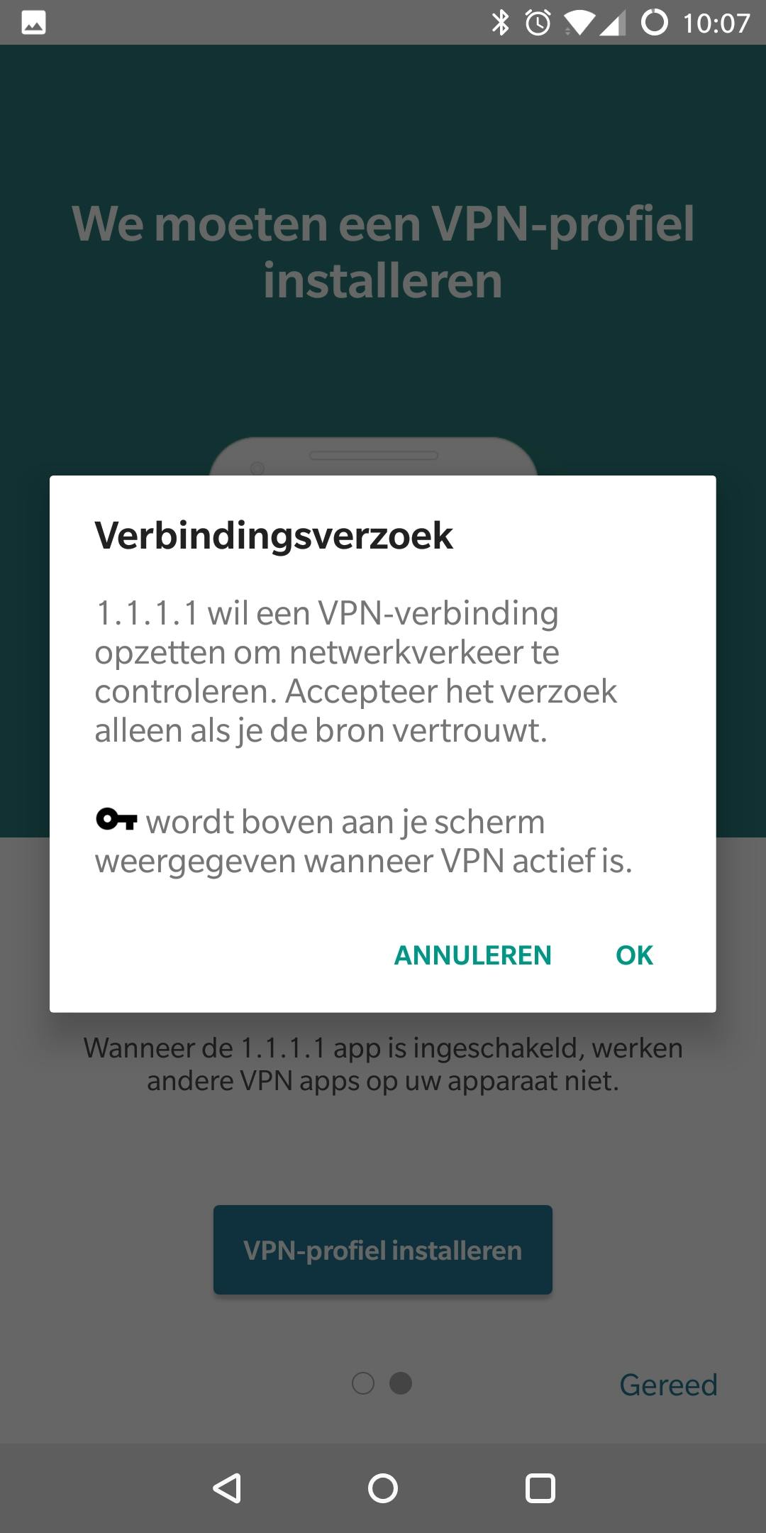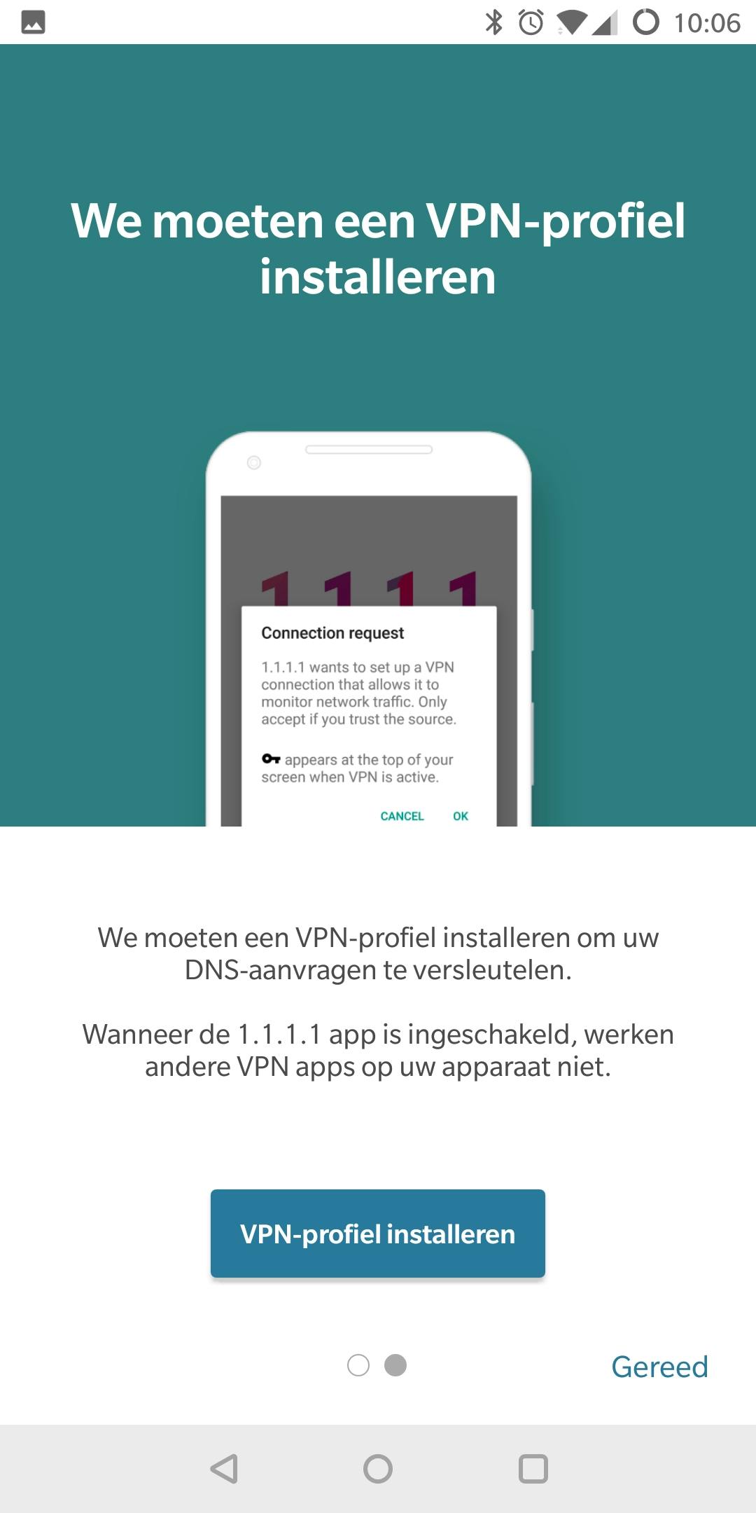Met de app 1.1.1.1: Faster & Safer Internet voor Android en iOS regel je dit heel eenvoudig. Download de app en start deze op. Swipe bij het welkomstscherm naar links en tik daar vervolgens op VPN-profiel installeren. Bij de pop-up voor een verbindingsverzoek kies je voor OK. Je krijgt de melding VPN-profiel is geïnstalleerd. Druk op Gereed.