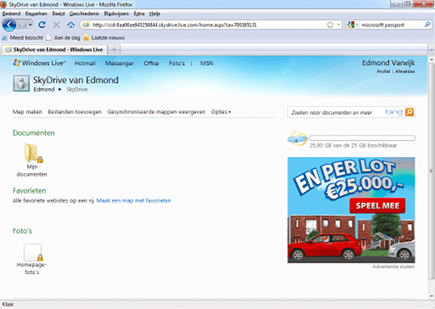 Centraal in de online functies van Office 2010 staat SkyDrive. SkyDrive fungeert als een 'harde schijf' op het internet. Iedereen met een Windows Live ID kan er bestanden op zetten, zowel voor zichzelf als om ze met anderen te delen. De opslagruimte die iedereen op SkyDrive heeft is maar liefst 25 GB groot. Om uw eigen gedeelte van SkyDrive te openen logt u in op Windows Live en zet u de muis op Windows Live. In het menu dat verschijnt kiest u voor SkyDrive.