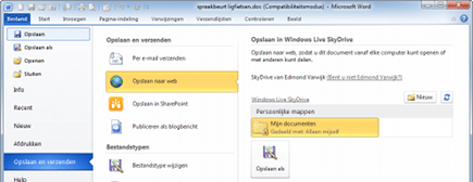 U kunt een document direct opslaan op Windows Live SkyDrive.