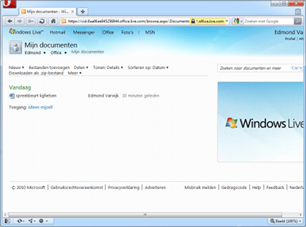 Vanuit de verschillende programma's in Office 2010 kunt u documenten rechtstreeks op SkyDrive opslaan. Open een Office-programma en kies Bestand, Opslaan en verzenden, Opslaan naar web. Klik op Aanmelden, typ uw Windows Live ID en het bijbehorende wachtwoord in en bevestig met Enter. Wacht tot uw gegevens zijn gecontroleerd. In het venster verschijnt nu de inhoud van uw SkyDrive. Standaard staat in iedere SkyDrive een map genaamd Mijn Documenten, net zoals u die op uw computer hebt staan. Wacht tot het Opslaan als-scherm is verschenen en klik vervolgens op Opslaan om het document echt op SkyDrive te bewaren.