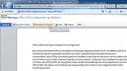 Om een document dat u eerder al op SkyDrive hebt geplaatst te openen, opent u eerst uw SkyDrive-locatie, zodat u alle mappen en documenten voor ogen krijgt. Om een document te openen in bijvoorbeeld Word Web App zet u de muis even stil bovenop een Word-document in uw SkyDrive-plek. Achter het document verschijnen nu extra opties. Klik op Bewerken in Browser. Word Web App wordt gestart en even later kunt u binnen de browser aan het document werken.