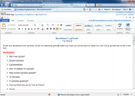 Een document bewerken in een Web-app gaat nauwelijks anders dan het bewerken in de volledige versie van bijvoorbeeld Word of Excel. U kunt tekst of een ander onderdeel van het document selecteren en u kunt het lint gebruiken om de opmaak aan te passen, om stijlen toe te voegen of om een tabel of afbeelding in te voegen. Ook kunt u de weergave aanpassen en in Word Web App bijvoorbeeld kiezen voor de leesweergave. Om wijzigingen te bewaren klikt u - net als in de echte Word - op het diskette-symbool op de werkbalk Snelle Toegang, linksboven in het browser-venster.