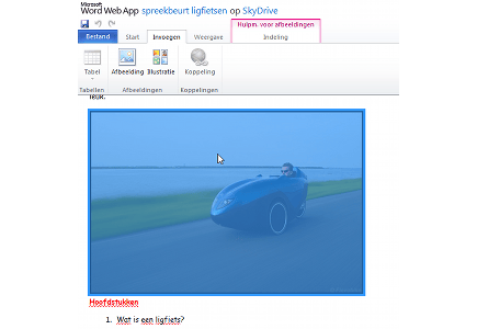 Van Word 2007 en 2010 is bekend dat ze een interactief lint hebben. Dat wil zeggen dat de functies op het lint worden aangepast aan de hand van wat u in een document of in een Office-programma doet. Selecteert u een tabel, dan komt er een extra tabblad met opties om tabellen te bewerken. Als u een afbeelding selecteert, gebeurt hetzelfde met opties voor afbeeldingen. Ook in de Web-apps werkt dit zo. Selecteert u bijvoorbeeld een afbeelding in een document, dan verschijnt op het lint een extra onderdeel, namelijk Hulpmiddelen voor afbeeldingen. Klik daarop om de extra hulpmiddelen voor het werken met afbeeldingen te gebruiken. Opnieuw zijn het er minder dan in de volledige versies van Word, maar het is handig dat u ze zo kunt toepassen.