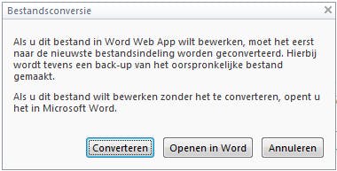 Om documenten ook online te kunnen bewerken is het bestandsformaat ervan belangrijk. Gebruikt u nog altijd de oude bestandsformaten van Office 2003 of eerder, dan is dit het moment om over te schakelen. SkyDrive werkt het beste met docx en xlsx, de nieuwe bestandsformaten van Office 2007 en Office 2010. Wilt u een ouder documentformaat bewerken in de browser, dan krijgt u de melding dat het document eerst moet worden geconverteerd. Klik daarvoor op Converteren. SkyDrive is daarbij zo slim dat het van het geconverteerde document een apart bestand maakt. Het oorspronkelijke document blijft dus behouden. Wilt u niet converteren, dan is online bewerken niet mogelijk en kan het document vanaf SkyDrive alleen in de echte verse van het Office-programma worden bewerkt. Dit is een beperking van de online applicatie.