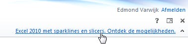 Ook op het lint - of altijd net erboven - staan aanprijzingen van de volledige versies van Office-programma's. Dit lijkt vooral het geval wanneer er geen volledige versie van Office op uw pc staat. Microsoft maakt dan wat reclame om u over te halen tot de aanschaf van de volledige versie van het pakket. U bent hier uiteraard niet toe verplicht en u kunt ervoor kiezen de snelkoppelingen naar het 'ontdekken van de mogelijkheden van...' niet te volgen. Gewoon een kwestie van er niet op klikken!