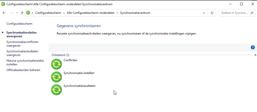 Open daarom het Configuratiescherm door in de taakbalk de naam van dit systeempanel te typen. Kijk rechtsboven in het Configuratiescherm. Als dit is ingesteld op Weergave: Categorie, dan moet je dit wijzigen in Weergave: Grote Pictogrammen. In deze modus open je het Synchronisatiecentrum.